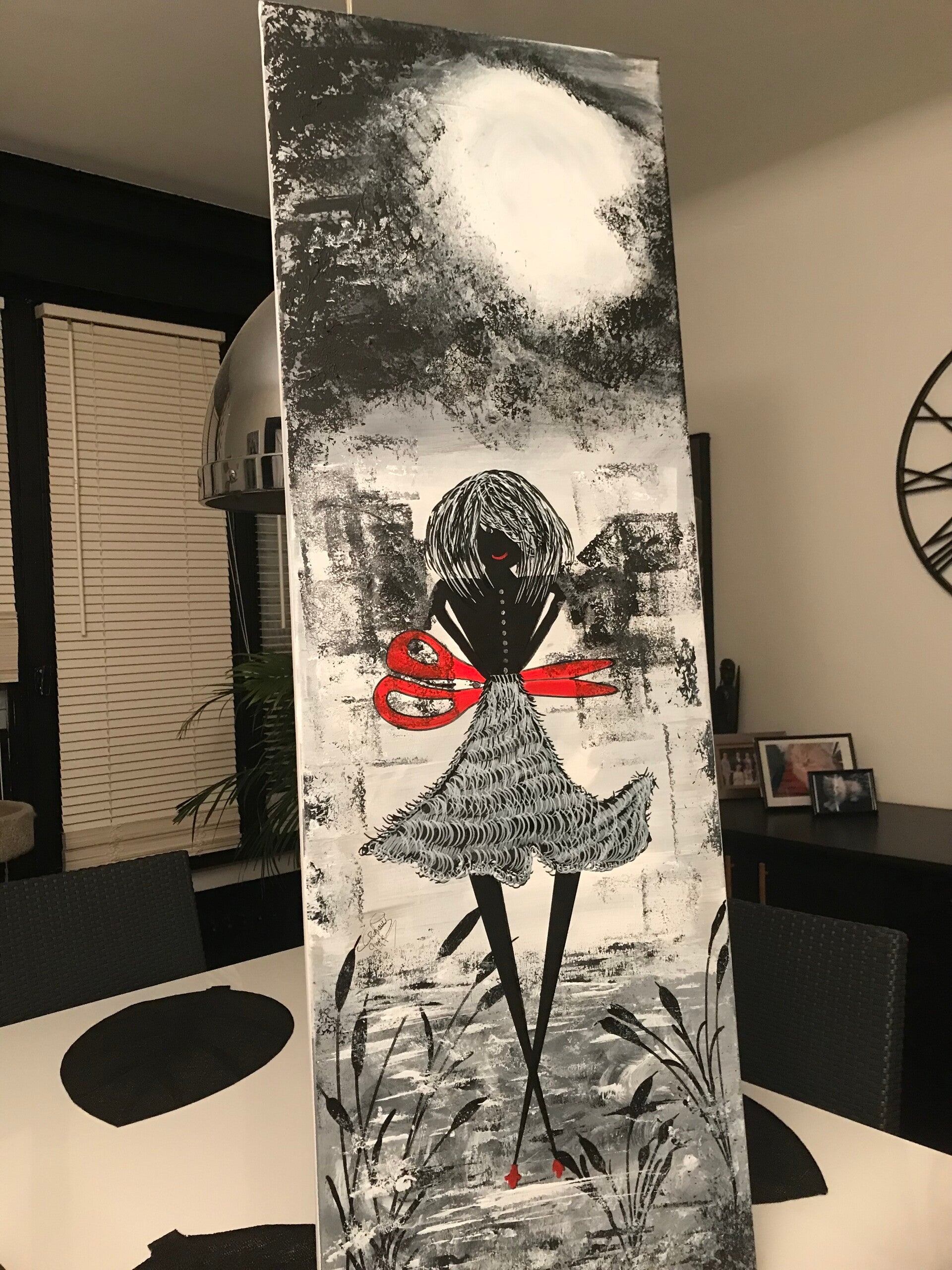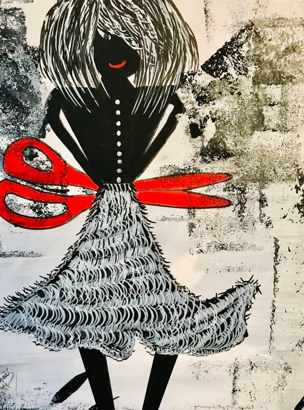 Ses ciseaux ✂️ rouges tranchent la monotonie du noir & blanc, suggérant une métaphore du destin, du contrôle ou du sacrifice.