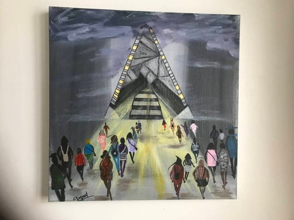 Des silhouettes 👥 anonymes, esquissées, en marche vers une pyramide entre vaisseau 🚀 et sanctuaire …
