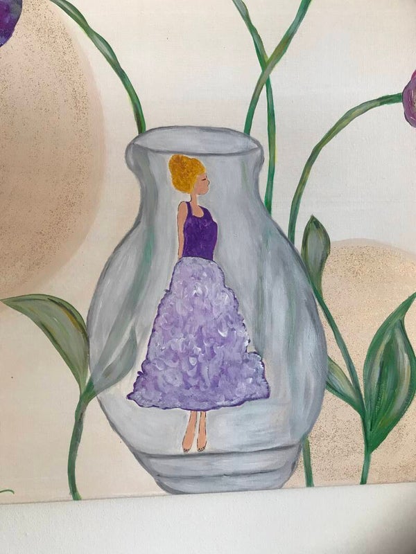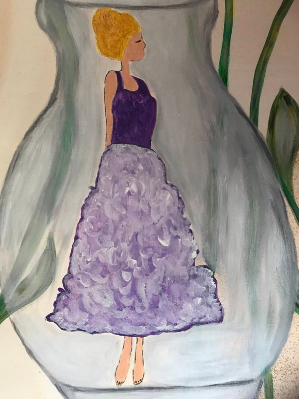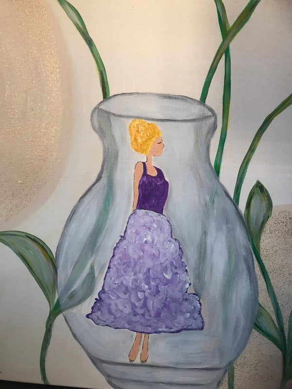Cette œuvre très originale et douce à la fois, est intitulée ( LA PRISONNIÈRE DU VASE) elle représente une jeune fille qui évolue paisiblement dans ce joli 🏺 vase.