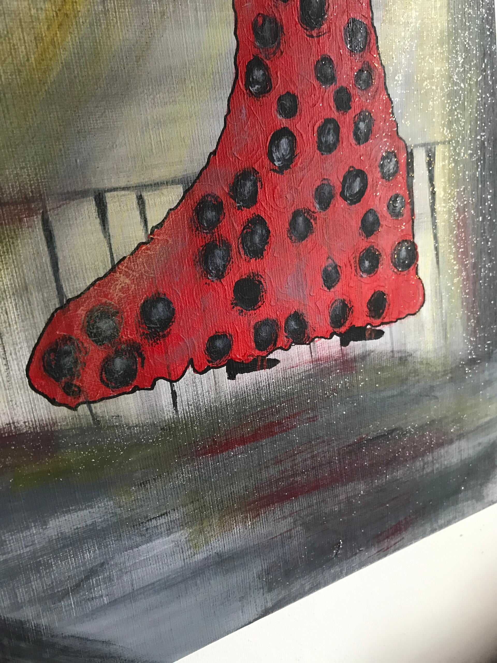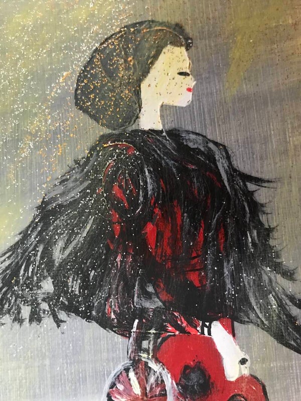Dans une atmosphère brumeuse aux nuances de gris et d'or, se déroule une scène énigmatique et troublante. Une silhouette féminine en robe rouge à pois noirs se tient seule sur un pont, baignée par la lueur dorée d'un réverbère solitaire. Son regard est tourné vers l'inconnu, vers ce qui l'attend dans la pénombre.